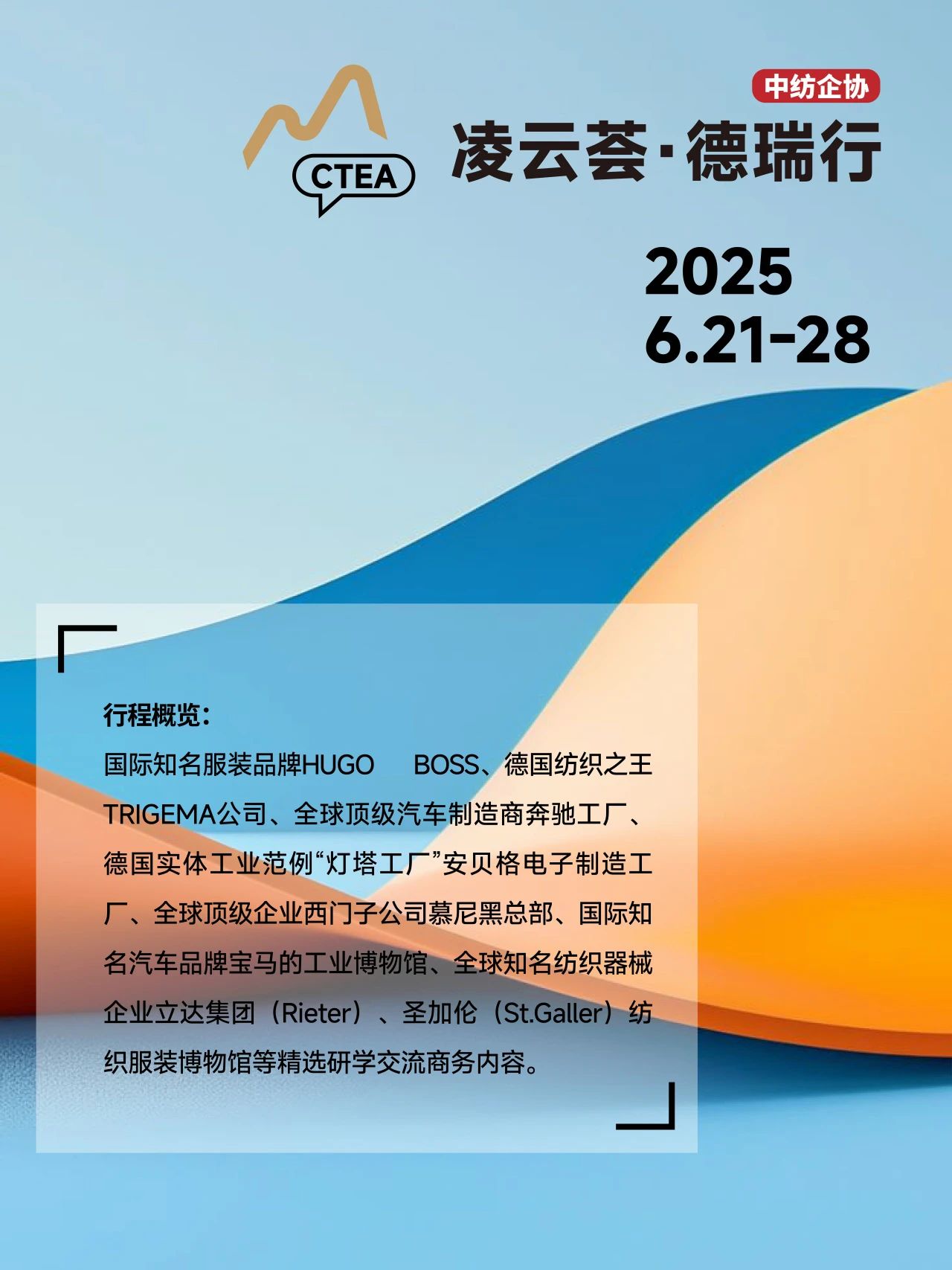 瑞士机床被誉为全球工业界的瑰宝,德式精工则是全球工业领域的典范。德国与瑞士作为欧洲经济与科技的双引擎,汇聚了世界领先的产业资源、创新生态和管理模式,正成为观察世界经济脉动、把握科技进步方向的绝佳窗口。6月21-28日,中纺企协“凌云荟·德瑞行”集结纺织服装企业家、高管,开启了一场沉浸式感受工业4.0的研学交流之旅,中国纺织服装企业家们走进德瑞百年名企,实地探访精益生产之道,深度感受工匠精神之意。