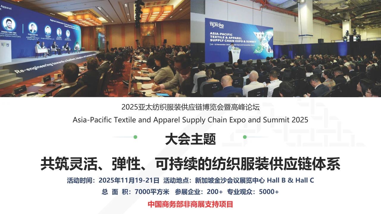 2025年11月19日-21日,2025亚太纺织服装供应链博览会暨高峰论坛将再次在新加坡金沙举办。新加坡亚太展是由中国纺联联合东盟纺联以及亚太各主要产业链参与方,共同构建的互惠共赢的区域产业链供应链共同体。